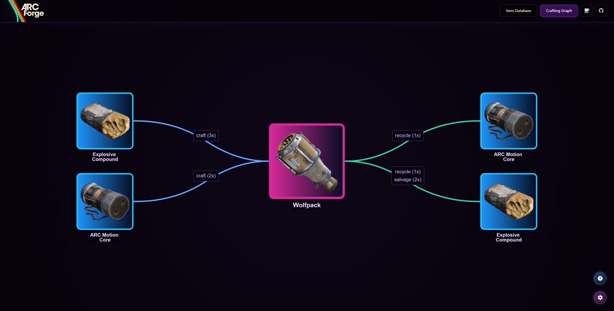 The database makes specific examples easy to spot. Looking up Wolfpack and Arc Forge shows how many items are needed to craft and how many items it yields when recycled. Whatever you want to craft, it shows exactly how many items you need of those.