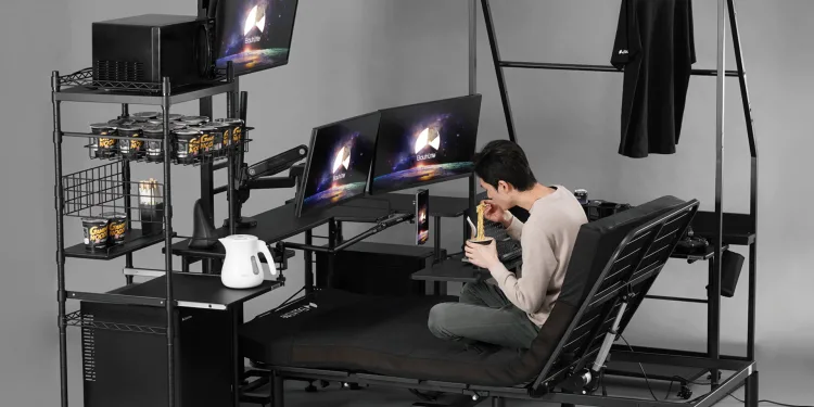 Bauhutte’s machine-translated product copy asks, “Do you want to make ‘gaming while lying down‘ a full-fledged part of your daily life?” and describes the product as a “forbidden layout designed specifically for the unapologetically indulgent gamer.” The company’s promotional imagery pairs the bed with other Bauhutte accessories, including wire racks and cupholders, in a compact bedroom setup staged around multiple displays.