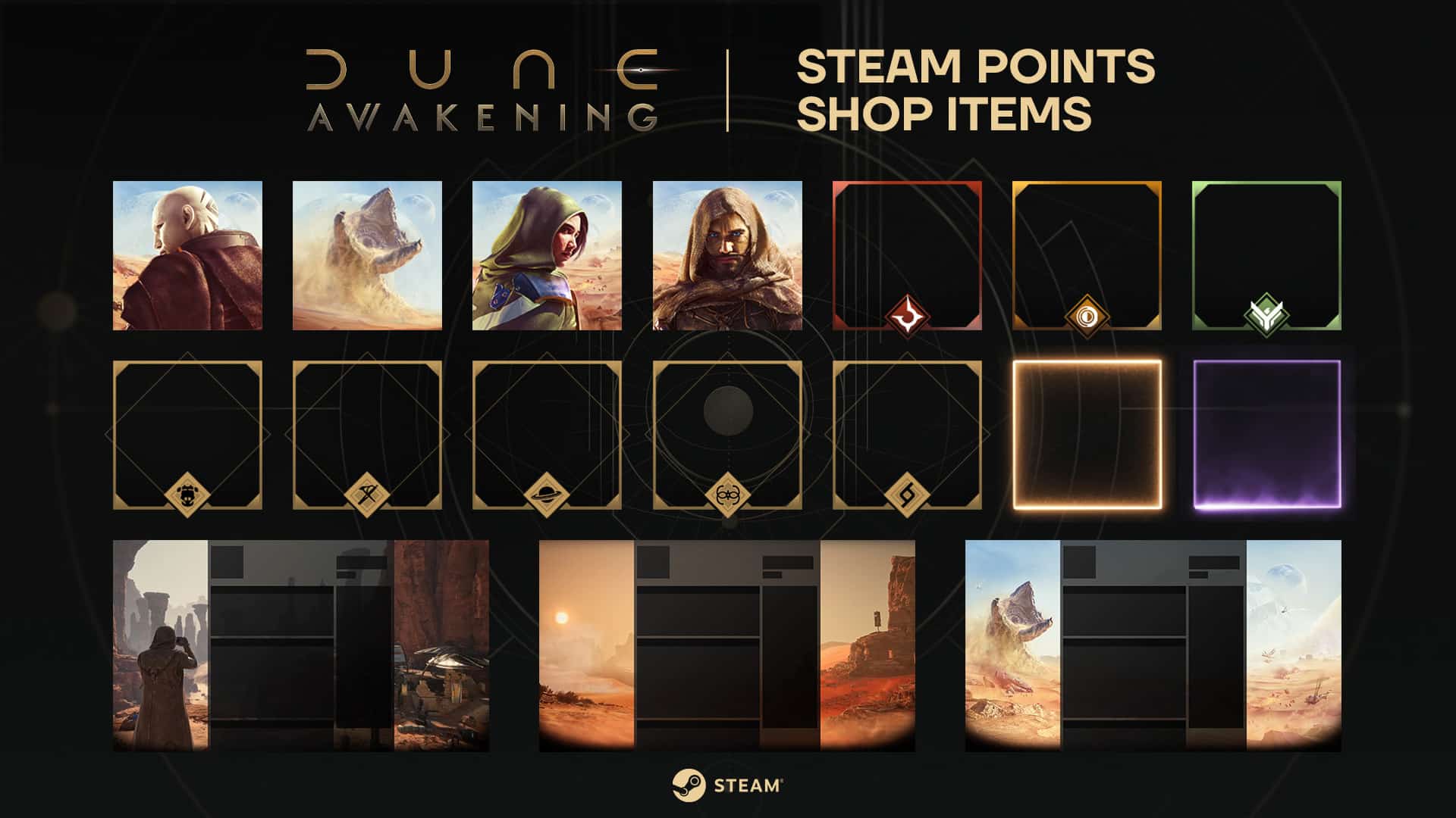 Dune: Awakening has added community items to its Steam presence, letting players earn trading cards, craft and upgrade badges, and collect profile rewards. The set is available now on Steam for players who want to personalise their profiles with Arrakis-themed art.