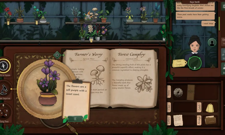Strange Horticulture puts the player in the role of a plant shop owner who arrives in the alt-history Lake District town of Undermere. Each day, customers come with fragmentary descriptions of plants, and the player must identify specimens using a magnifying glass and a strange horticultural text. The system is simple on the surface and gradually reveals a darker, eerie story.