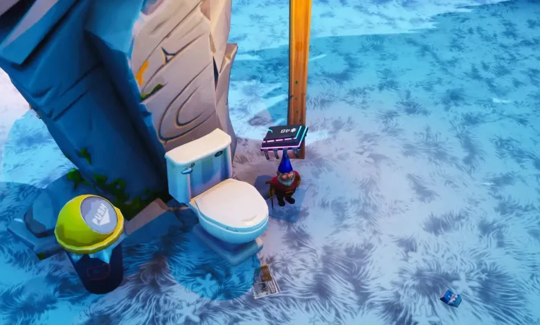 If we go closer than just a top-down perspective of the map, you will find three stone objects and one of them is considered to be a throne by having a toilet next to it. The gnome is easily noticeable just right from next to the toiler. See the picture below for better understanding, with perspective over Happy Hamlet.