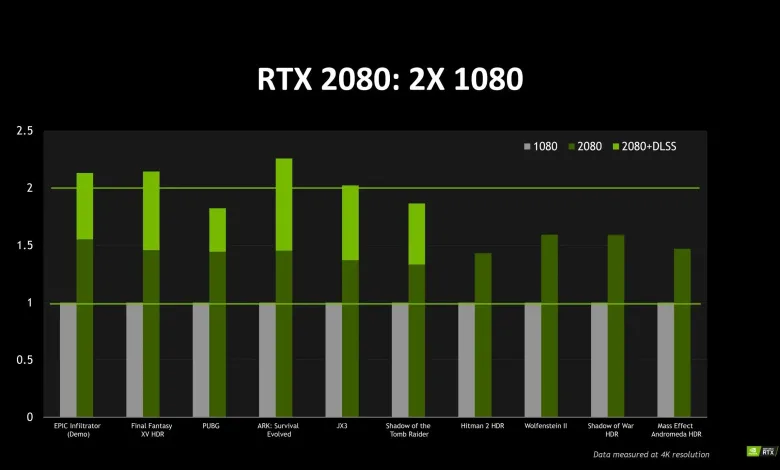 However, the Shadow of the Tomb Raider has showcased an awful performance with a diverging fps of between 30-70, which at first look it doesn’t resemble any solidness. But now, the new image posted by Nvidia claims something different, including the performance with the new DLSS (Deep Learning Super Sampling) enabled. The picture below clearly states that the RTX 2080 is twice the power of any 1080, will support new video games at 4K HDR at higher performance than the GTX 1080.