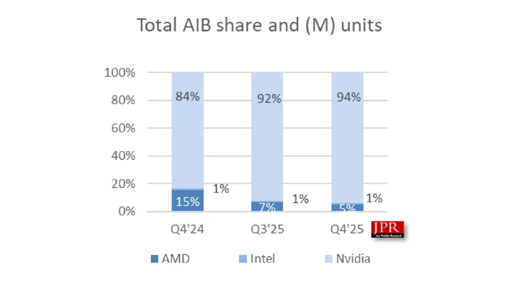 New data from Jon Peddie Research shows the desktop graphics card market cooled in the final quarter of 2025 even as Nvidia widened its lead in market share. The report records a quarter-on-quarter AIB shipment decline of 4.4%. Year-on-year shipments were up by about 36%, but that gain follows a wave of new launches from both AMD and Nvidia since late 2024. More important for immediate market health is the quarter-on-quarter drop.