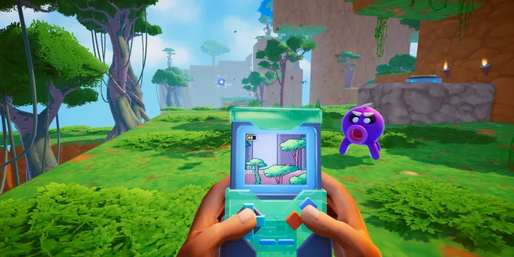 From a first-person viewpoint players look out over a full 3D world. At the bottom of that view the Qboy shows an overlayed version of the level as a flattened 2D platformer. That handheld view functions like a retro screen inside the 3D environment; the preview labels it roughly “2.5D.” That dual presentation is more than cosmetic. The 2D display often offers the clearest path to objectives. Key collectibles or routes that are hidden from a particular 3D vantage become obvious on the Qboy’s screen. Conversely, some obstacles and threats only appear in the 3D world. Players must shift attention between the two constantly to progress.